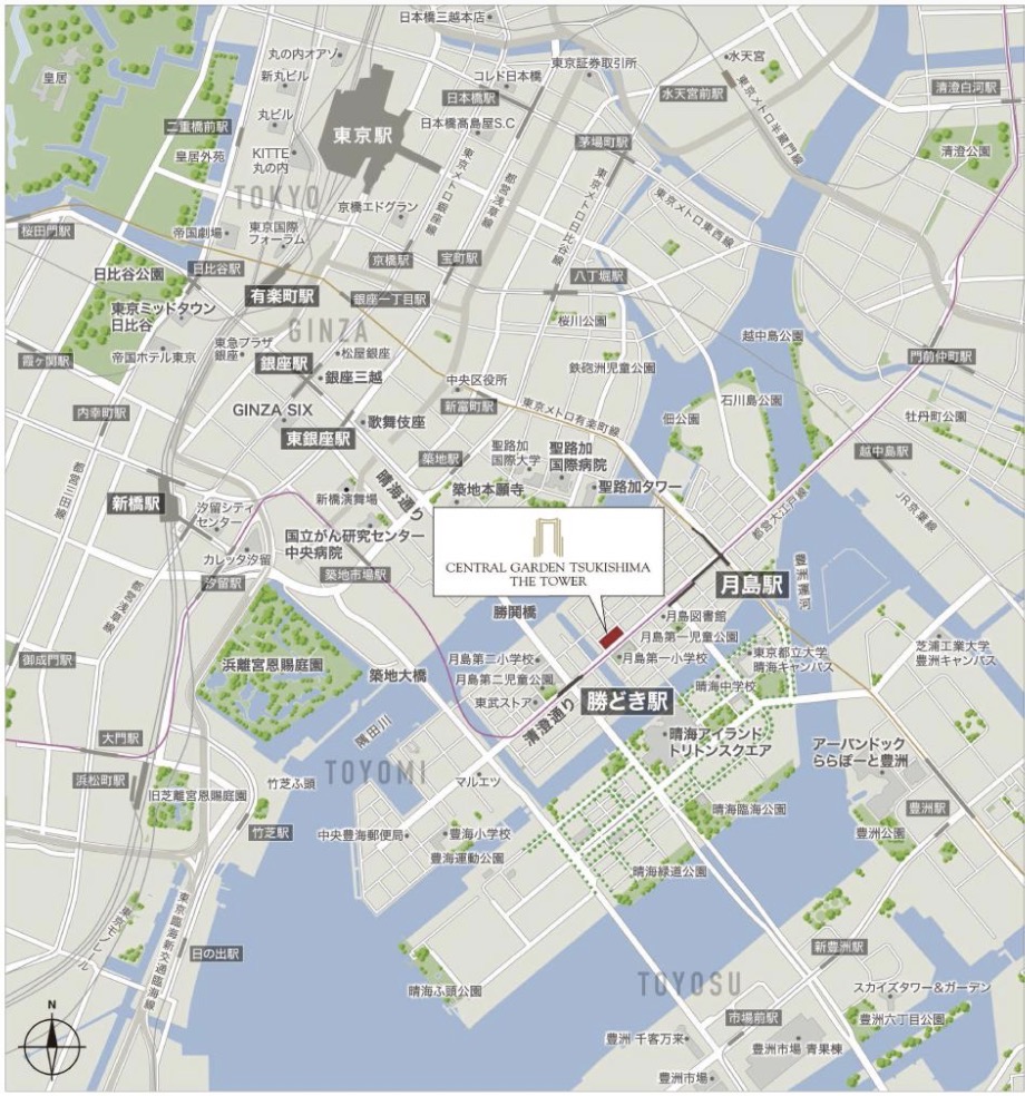 同エリアの競合物件であるグランドシティタワー月島は「月島駅徒歩5分・勝どき駅徒歩9分」。駅距離の面では、セントラルガーデン月島に軍配が上がります。